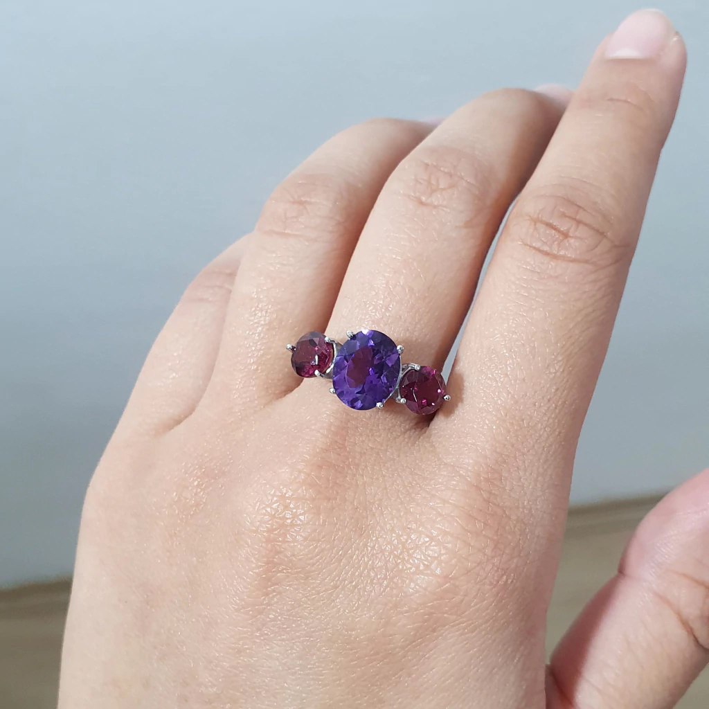 Anel em Prata 925 com ametista oval e rodolitas redondas, ambas naturais