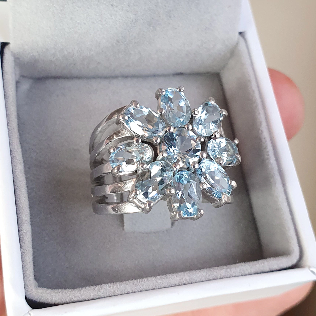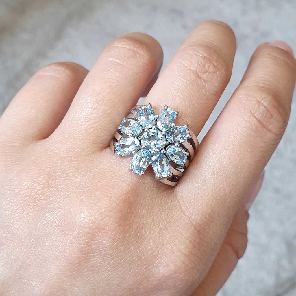 Anel em Prata 925 floral com pedras naturais a escolher (opção de topázio azul sky, topázio incolor, peridoto, ametista, citrino laranja, citrino amarelo e rodolita)