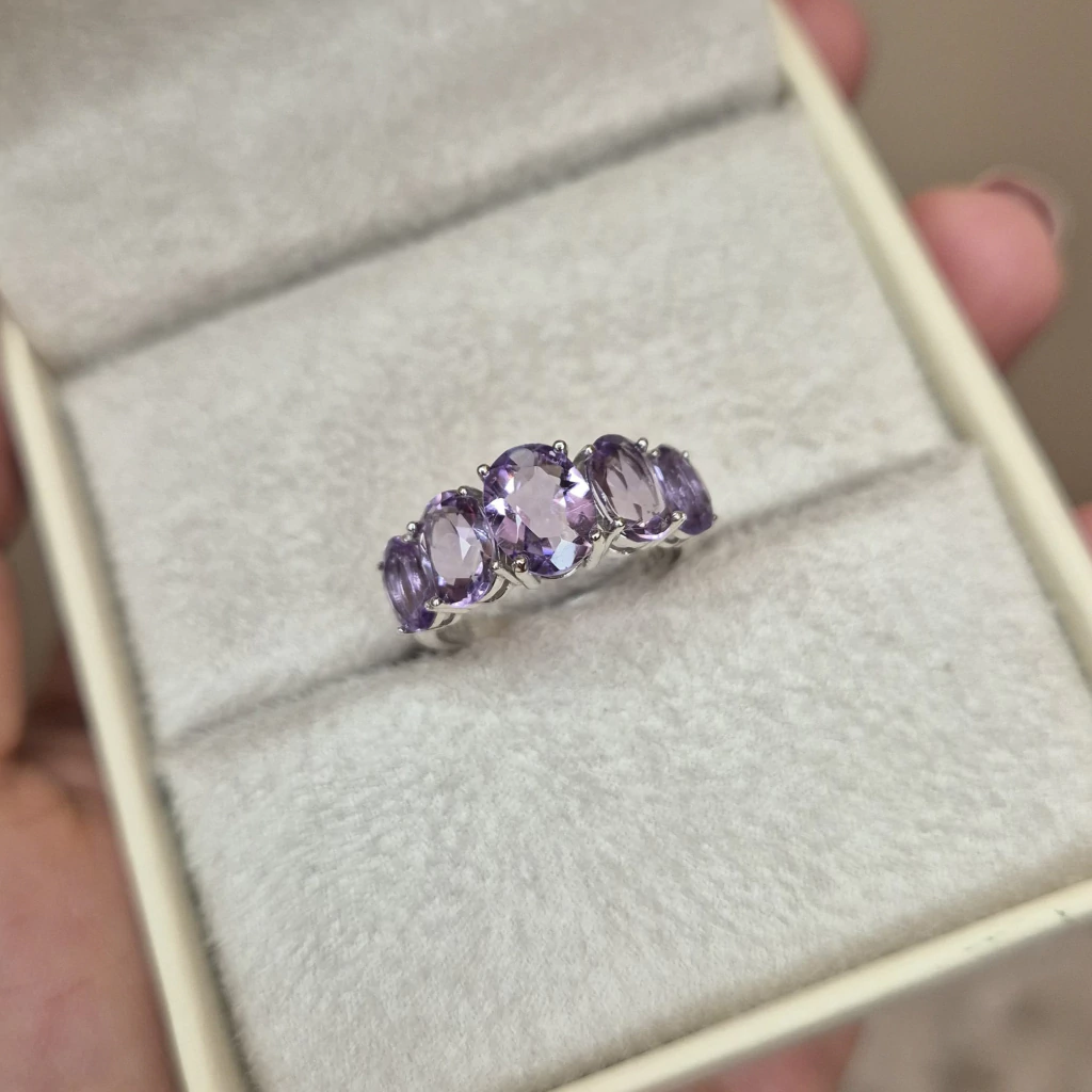 Anel em Prata 925 meia aliança com 5 ametistas lavanda ovais naturais