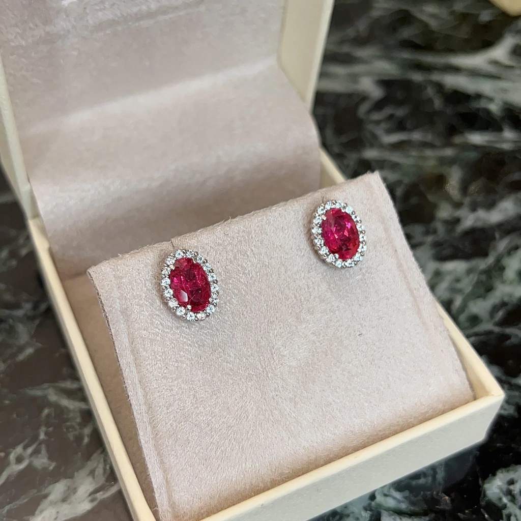 Brinco Prata 925 Oval Turmalina Rosa e Topázios Incolores